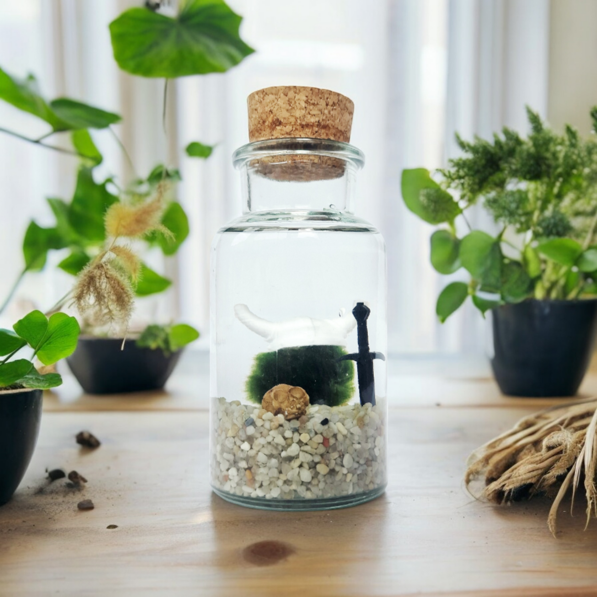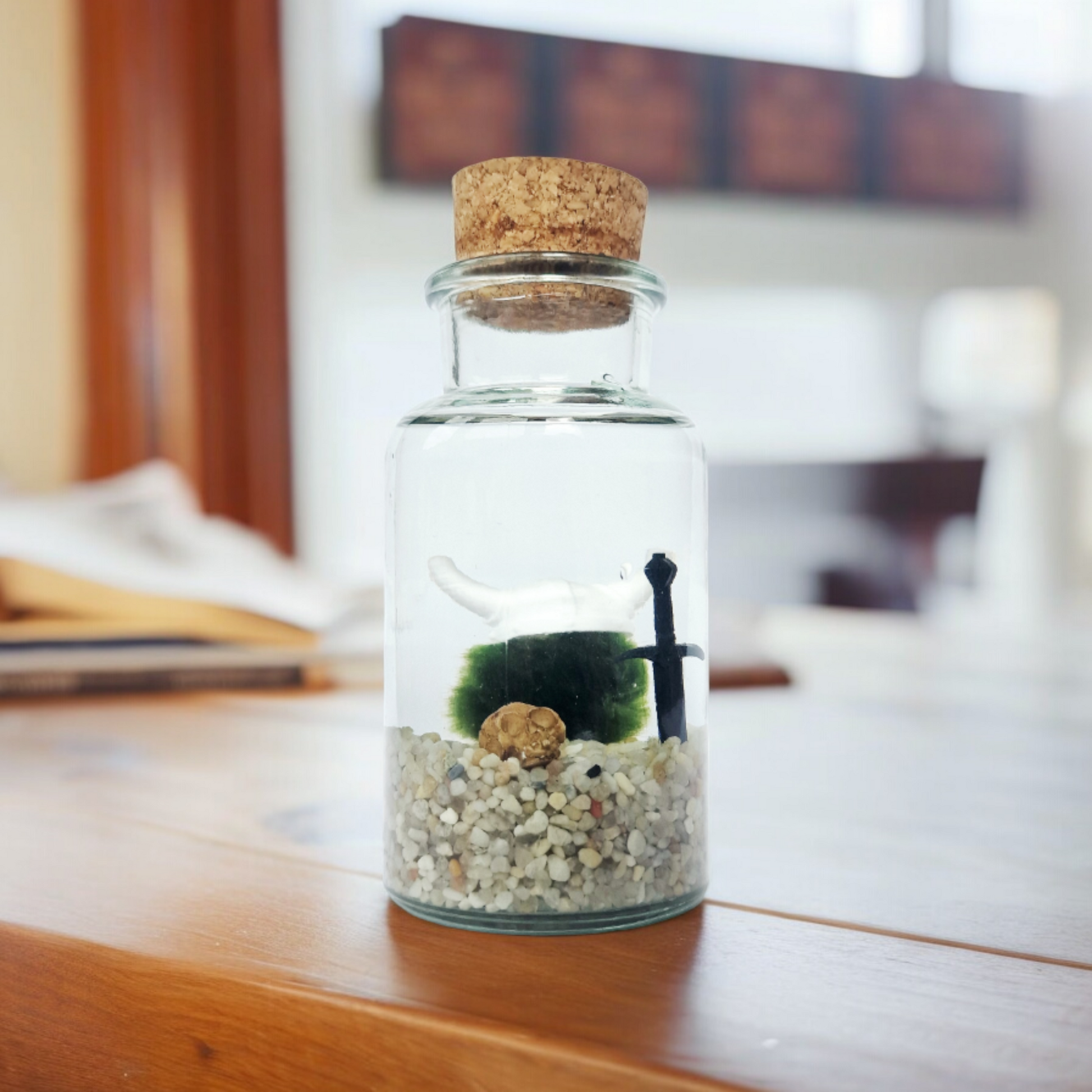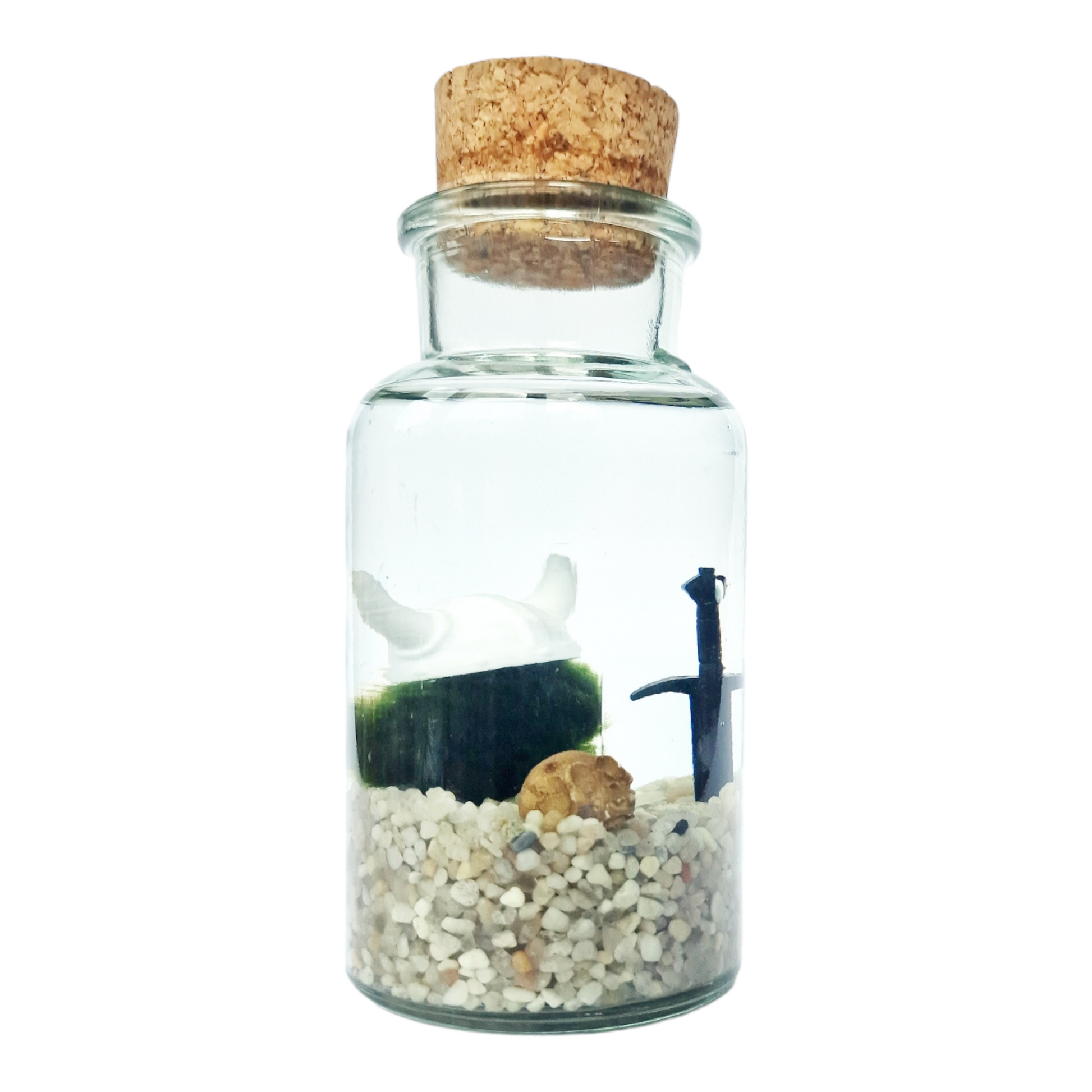 A little Viking Marimo with a white Viking hat, skull, and sword. Comes disassembled and includes: